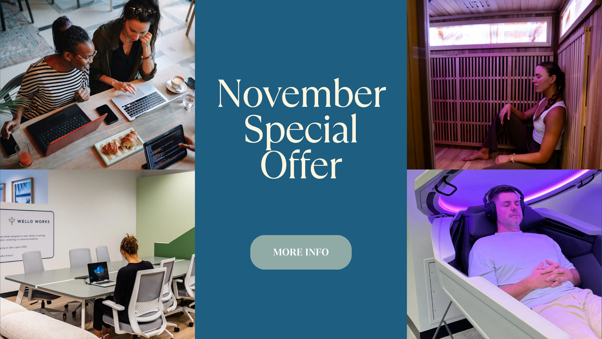 Coworkers have unlimited access to the Wello Lounge & credits to use in the Wello Collective.