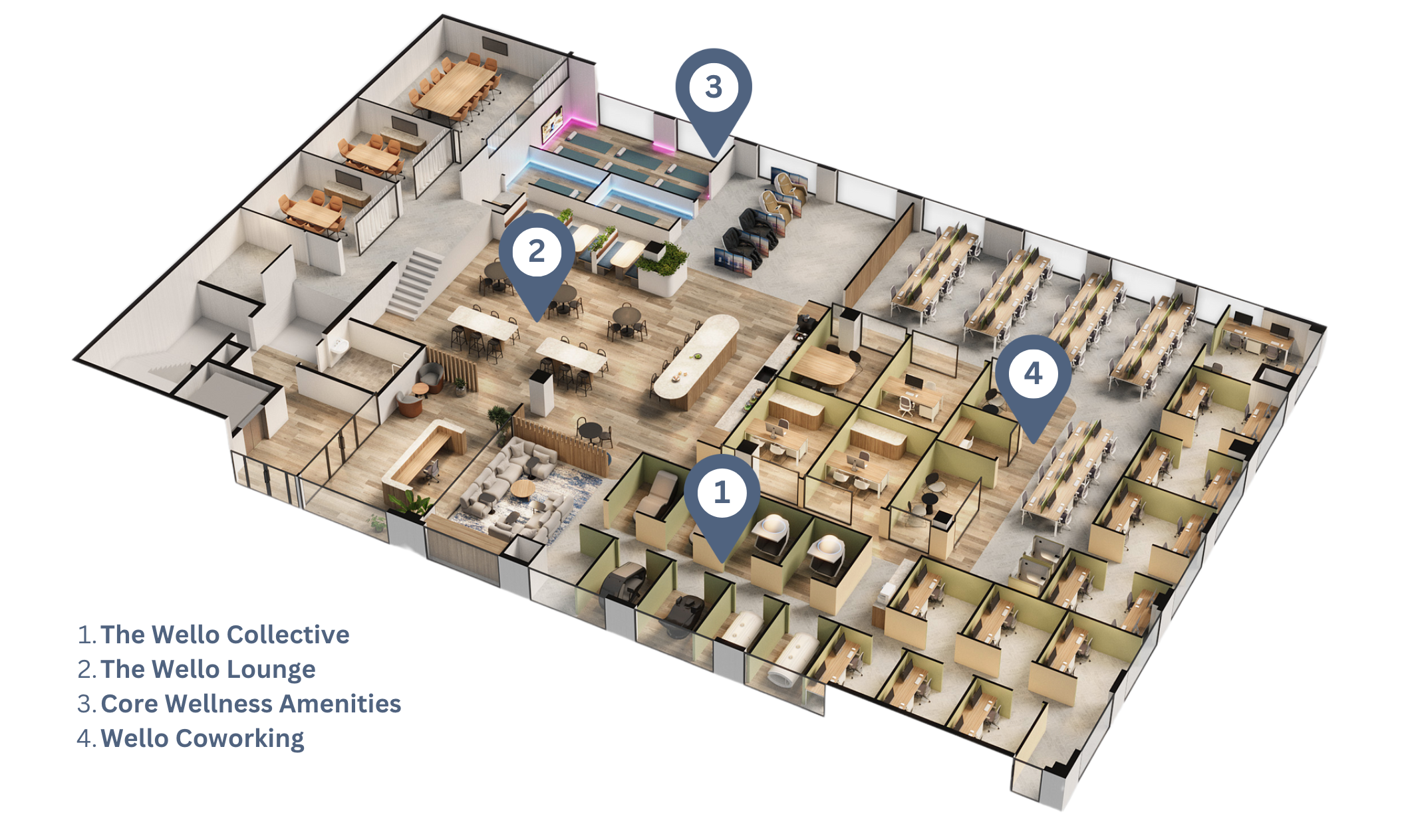 Coworkers have unlimited access to the Wello Lounge & credits to use in the Wello Collective.